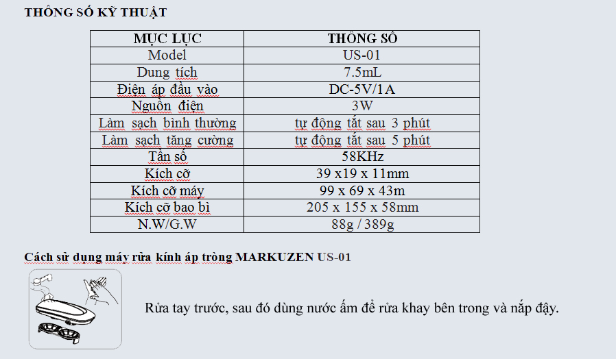 được rửa sạch, đảm bảo an toàn tuyệt đối, giúp bạn tránh được những rắc rối do vệ sinh kính không đúng. Sóng siêu âm có hiệu quả diệt khuẩn cao vì vậy nó giúp chăm sóc mắt tốt hơn sau khi làm sạch. Hãy chọn chức năng “5 phút tăng cường làm sach” có tính năng khử trùng cao và nên sử dụng 01 lần 01 tuần. Máy US-01 có thể được sử dụng với sạc dự phòng. Đây là máy rửa siêu âm xách tay nhỏ gọn và dễ sử dụng.