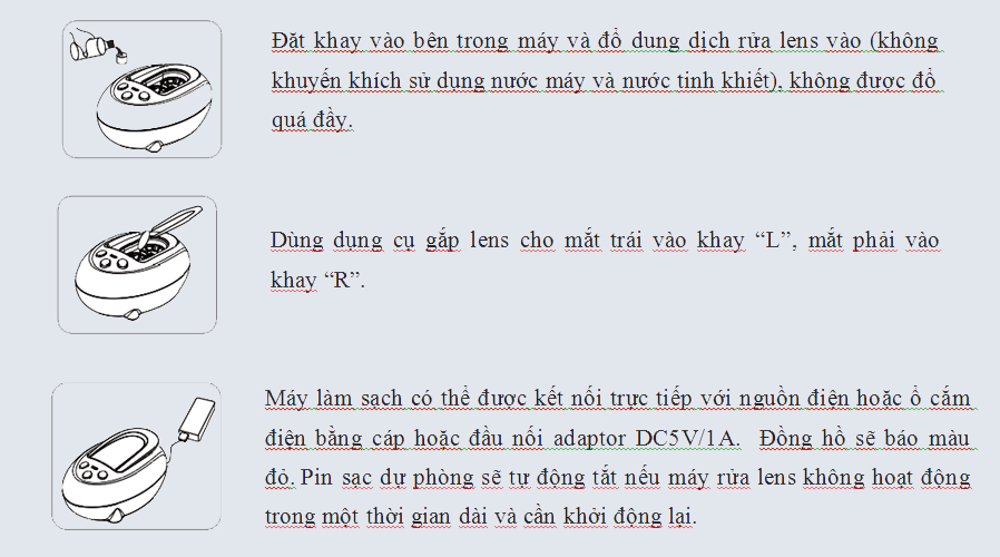 Máy rửa kính áp tròng US-01 với công nghệ tiên tiến sử dụng nguyên lý làm sạch bằng sóng siêu âm và tần số 58 kHz, bạn chỉ cần cho kính cùng dung dịch rửa vào trong khay của máy, sau đó nhấn nút chờ ba phút, tất cả bụi bẩn, protein của mắt còn đọng lại trên 2 bề mặt của kính sẽ